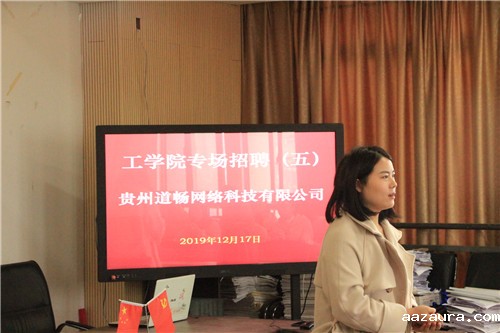 2019年12月17日上午10:00分,贵州道畅网络科技有限公司专场招聘宣讲会在执矩楼409会议室开展。工学院2016级应届毕业生参加本次招聘会。