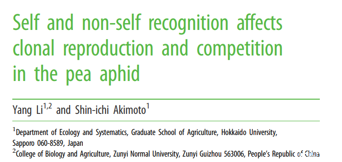 近日,我校生物与农业科技学院(食品科技学院)李杨博士(副教授)与日本国立北海道大学秋元信一教授合作的最新研究成果“Self and non-self recognition affects clonal reproduction and competition in the pea aphid” 在线发表在权威生物学综合性期刊Proceedings of the Royal Society B: Biological Sciences(简称Proceedings B)上。Proceedings B是生物学的TOP期刊,也是全球82个自然指数(Nature Index)期刊之一。