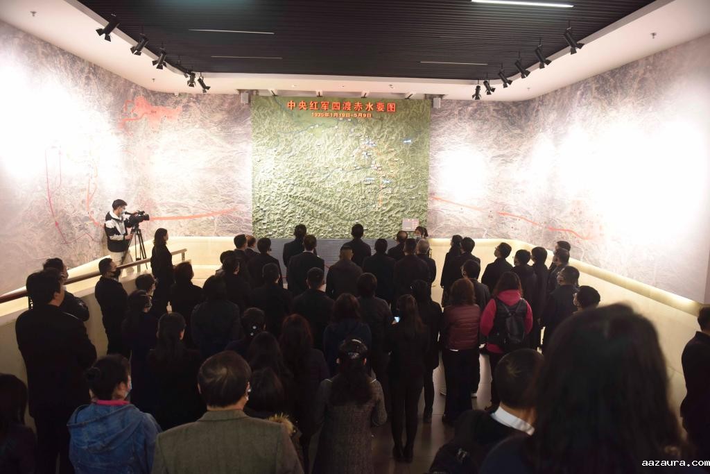 在四渡赤水纪念馆,大家齐声合唱《没有共产党就没有新中国》《四渡赤水出奇兵》,在歌声中回顾党的历史,感悟革命精神。四渡赤水战役是中央红军为争取战略主动于1935年1月至3月在贵州、四川、云南三省边境地区进行的高度灵活的运动战,是红军以少胜多、变被动为主动的光辉战例,被誉为“长征史上最光彩神奇的篇章”。一边聆听讲解员关于四渡赤水战役的介绍,一边看着陈列的革命物件、图片等,大家无不被革命先辈坚定的理想信念、高超的军事指挥艺术所感动、折服。