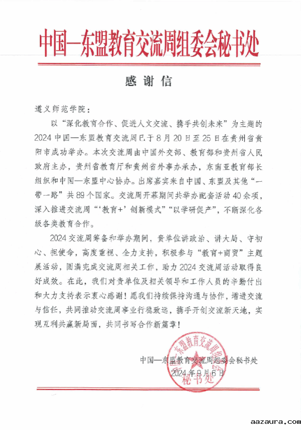 本网讯(施宣) 9月6日,中国-东盟教育交流周组委会秘书处向米兰体育中国官网网址发来感谢信。