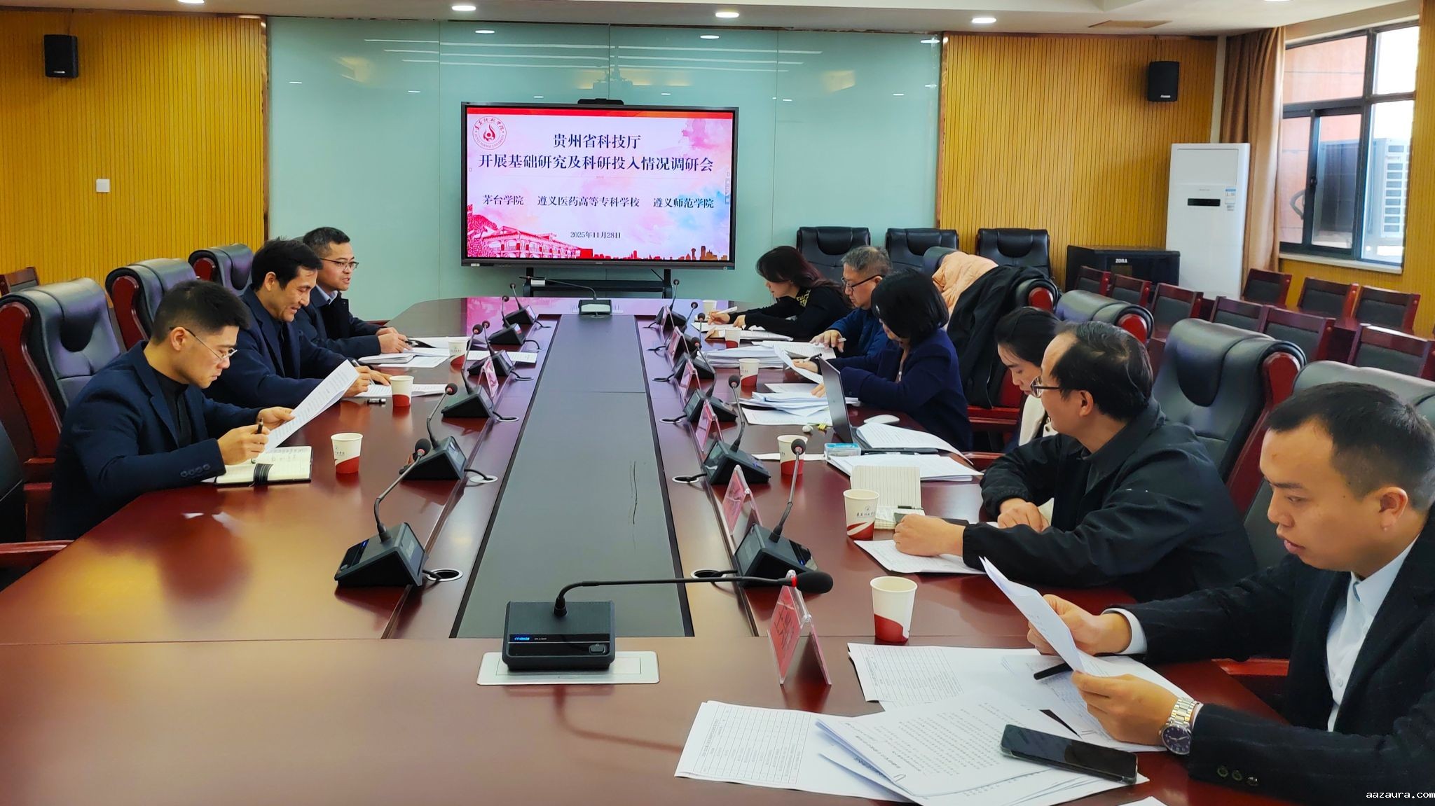 11月28日,省科技厅基础研究与科研条件处处长黎玥、四级调研员陈婷婷、指导专家吴敏,联合遵义市工科局副局长李渝一行,莅临米兰体育中国官网网址开展基础研究及科研投入专题调研。米兰体育中国官网网址党委常委、副校长王小波,党委委员、科研处处长朱海及相关人员陪同座谈调研。