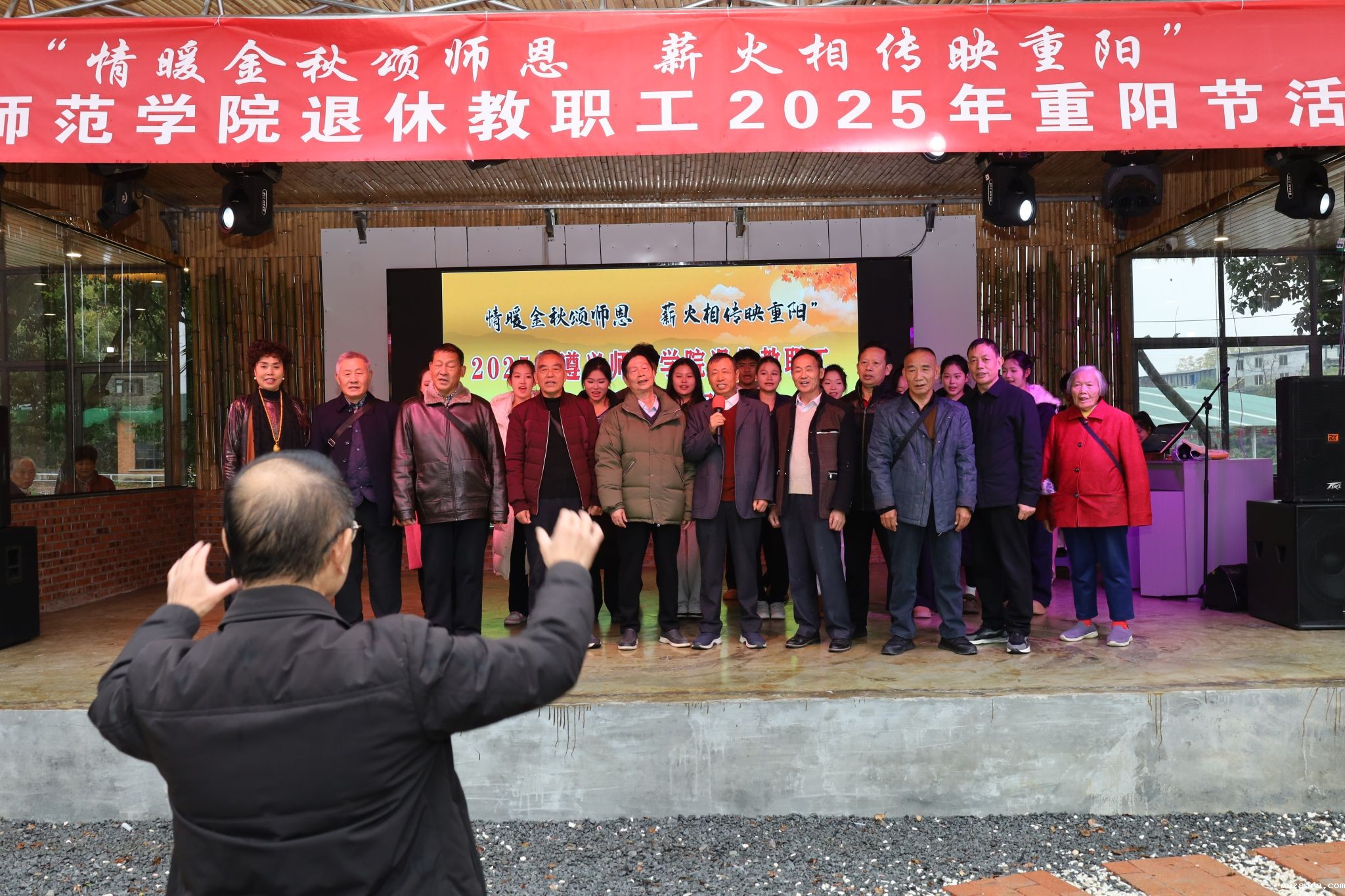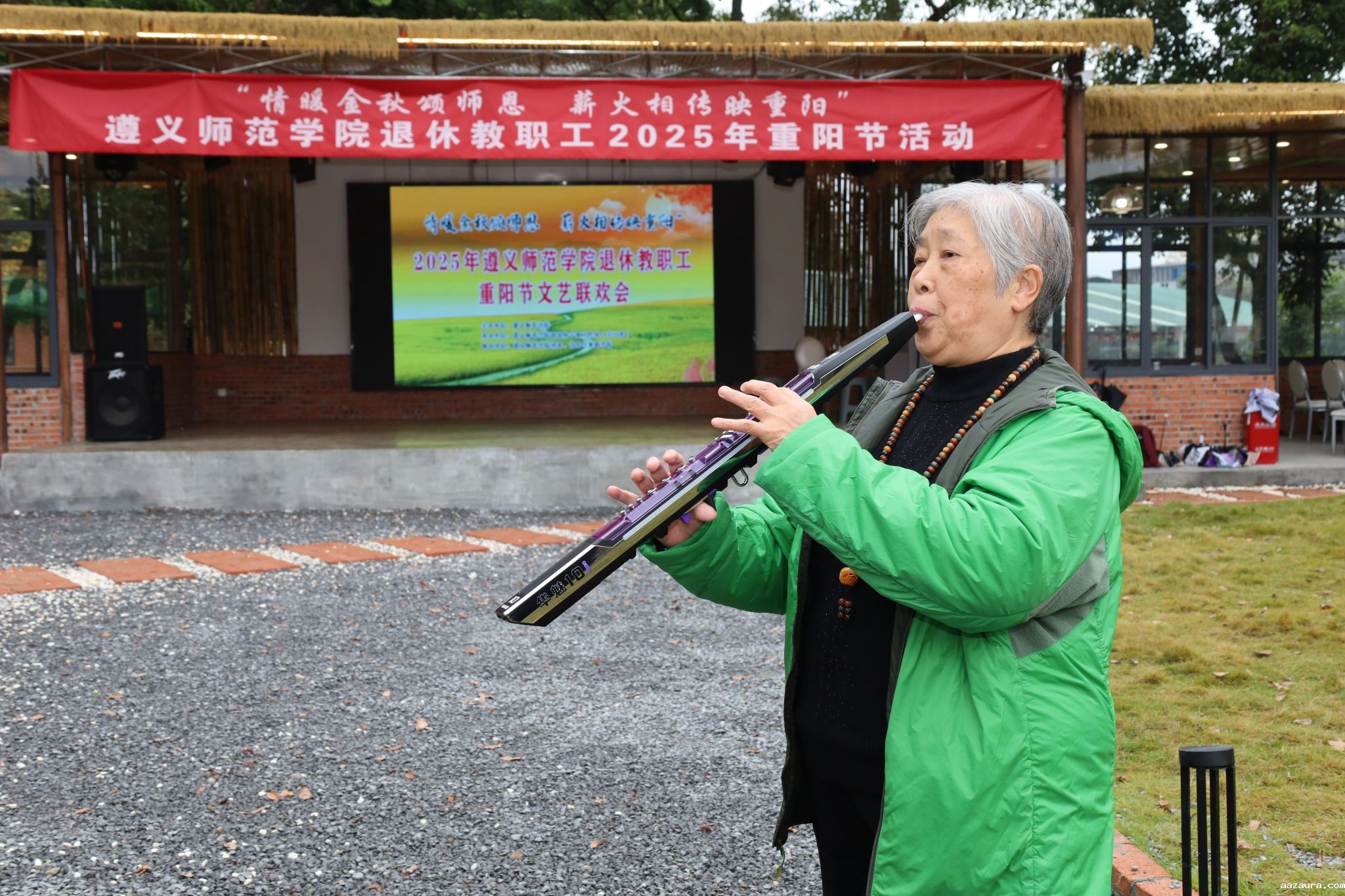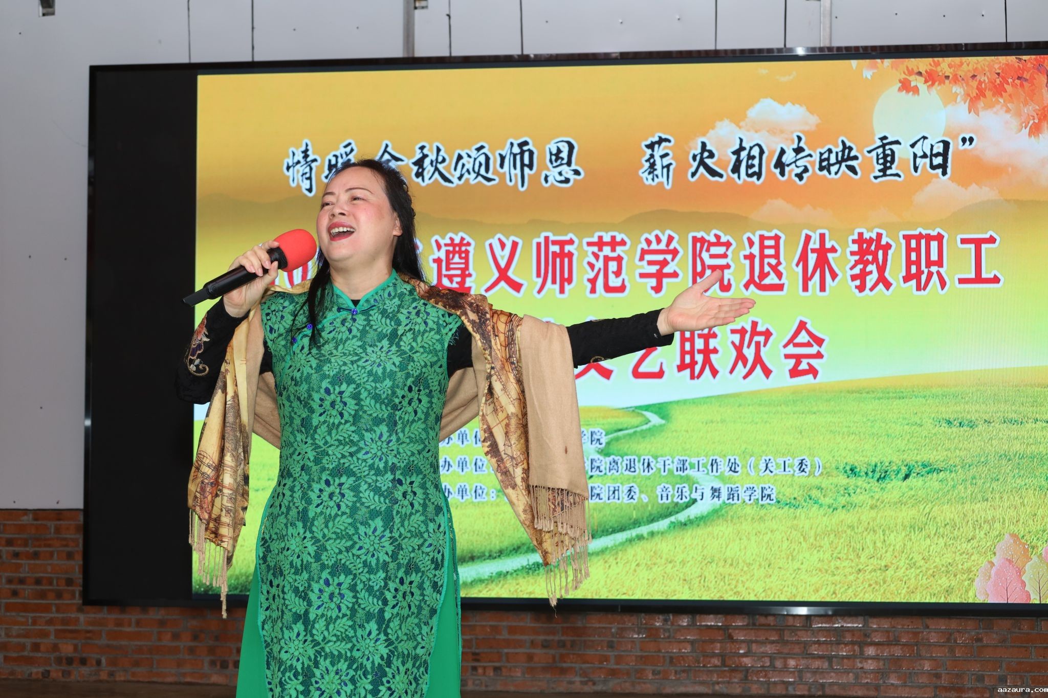 文艺演出时,精彩纷呈,高潮迭起。音乐与舞蹈学院教授班丽梅的歌曲《盛世田园》唱出国泰民安的祥和;李国士声情并茂的诗词朗诵《采桑子·重阳》《沁园春·长沙》赋予传统佳节新的时代韵味;杨远碧的电吹管独奏《祝福祖国》、李杰科的独唱《骏马奔驰跑边疆》、吴小林的吉他弹唱《风吹麦浪》、张少华的诗词朗诵《沁园春·雪》节目,充分展现了退休教职工多才多艺、积极向上的精神风貌。毕业学生、志愿者代表也纷纷献上歌舞等精彩节目,赢得了现场阵阵掌声。演出在退休第一党支部深情合唱《唱支山歌给党听》和退休第二党支部激昂高歌《祖国不会忘记》的嘹亮歌声中推向高潮,表达了老同志们对党的无限深情和对祖国建设者的崇高礼赞。