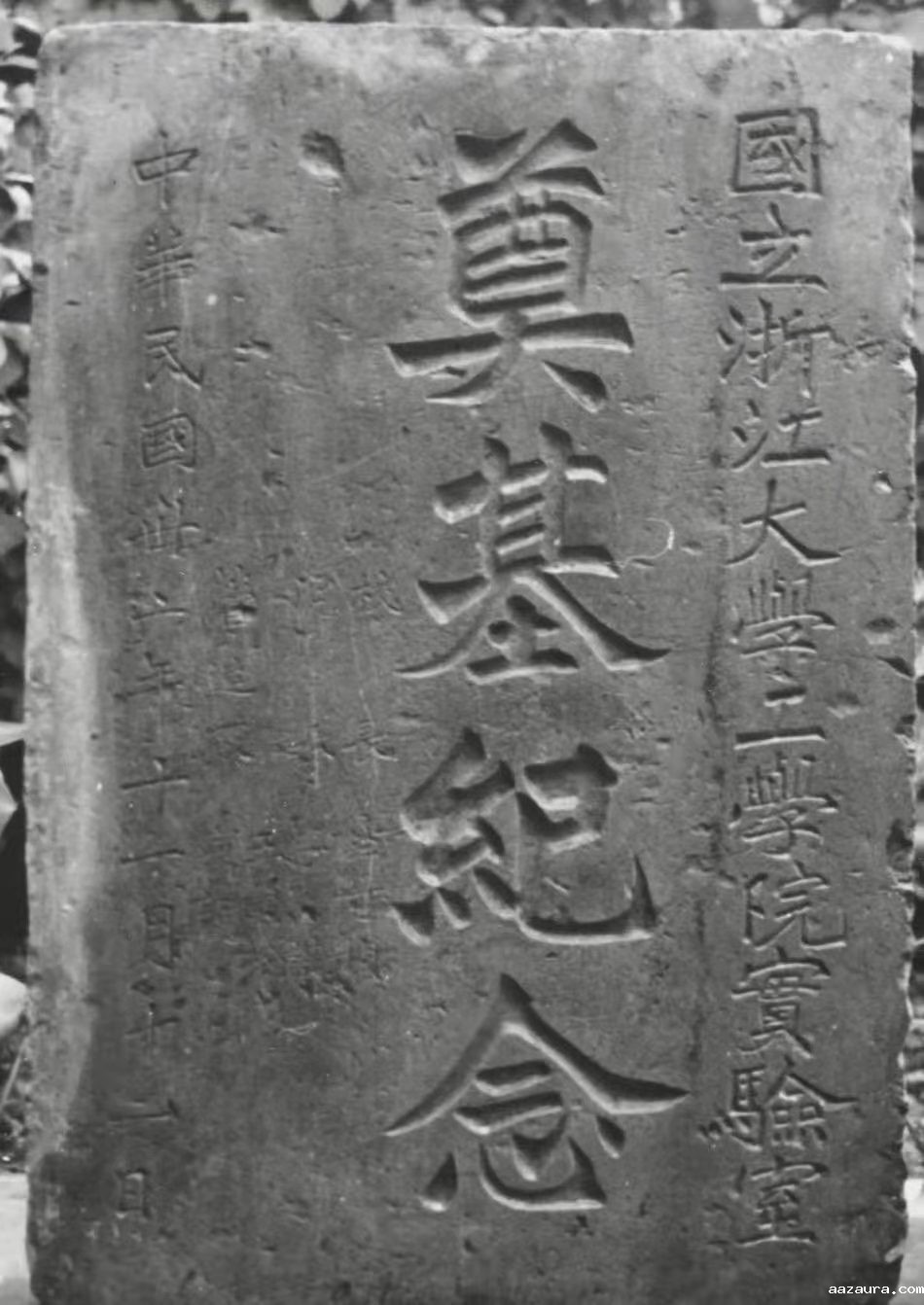 大约是1984年的下半年,时任遵义公园(现遵义纪念公园)办公室主任的花鸟画家蔡聪森,在动物园猴池旁靠遵义四中围墙花坛的堡坎处,不经意地发现一块方方正正的石头,斑斑驳驳的石面上,隐隐约约可以看到一些字迹。他凭着艺术家的直觉感到,这块石头应该有来历、有故事。冲洗擦亮后,赫然映入眼帘的石面右边抬头一行小字是:“国立浙江大学工学院实验室”,中间正文是“奠基纪念”四个大字,落款则依次是“校长竺可桢,院长李熙谋、王国松(代),营造厂寅记”,最后一行是立碑时间“中华民国卅二年十一月十一日”。