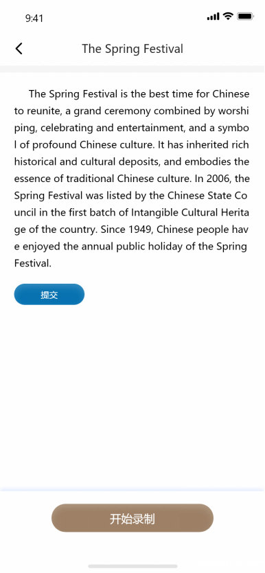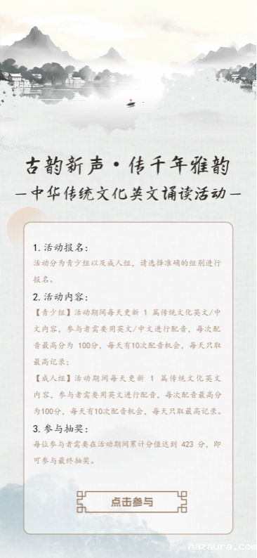 活动期间每天更新 1 篇传统文化英文内容,参与者需要用英文进行配音,每次配音最高分为100分,每天有10次配音机会,每天只取最高记录。