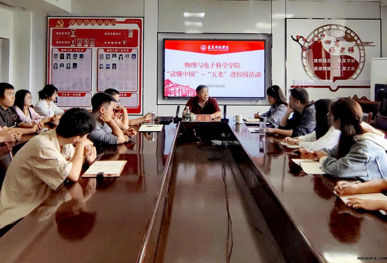 为厚植青年学子家国情怀,指引科研成长方向,2025年5月23日,物理与科学学院开展“读懂中国·五老进校园”主题活动。退休教师吴翔教授受邀作专题分享,学院党总支书记吴英主持会议,师生代表齐聚一堂,共赴这场意义非凡的思想盛宴。
