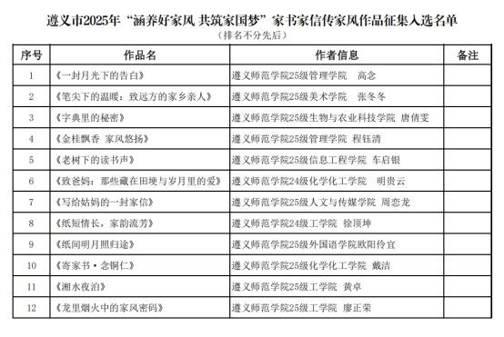 所有入选的优秀作品将于2025年10月10日至10月31日期间,通过遵义市妇女联合会官方微信公众号、遵师学工在线微信公众号等平台进行集中展播宣传。届时,广大师生可通过线上渠道,共同品读这些温暖人心的家书故事,感受字里行间的温暖真情,领略优良家风的深厚底蕴与时代光芒。